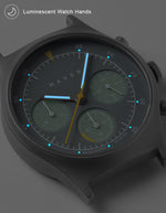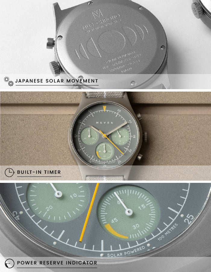 MAVEN のミニマリスト シルエットの象徴である MUS ソーラー クロノは、MUS コレクションと同様のデザインを踏襲していますが、外観がアップグレードされ、高度なソーラー パワー ムーブメントが組み入れられています。日本製のソーラー ムーブメントを象徴するこの時計は、太陽光や電気スタンドの下など、直射日光にさらされることで機能します。完全に充電されると、電力貯蔵は5ヶ月分のバッテリーを供給でき、6 時付近に表示されるため簡単に確認できます。